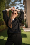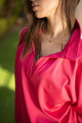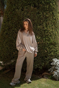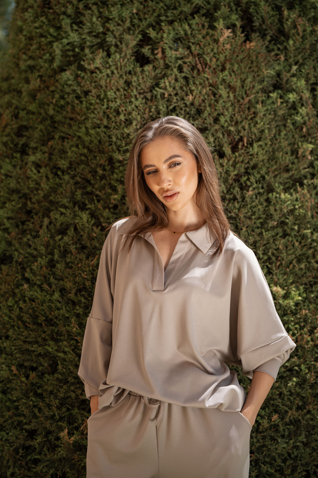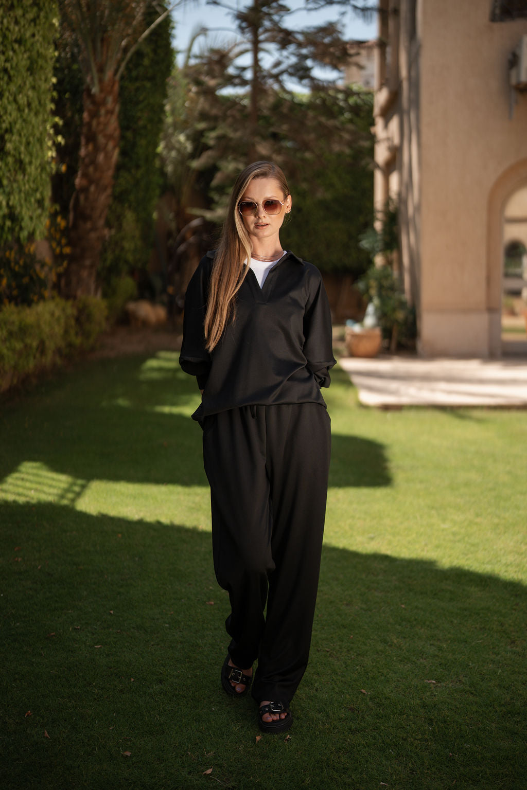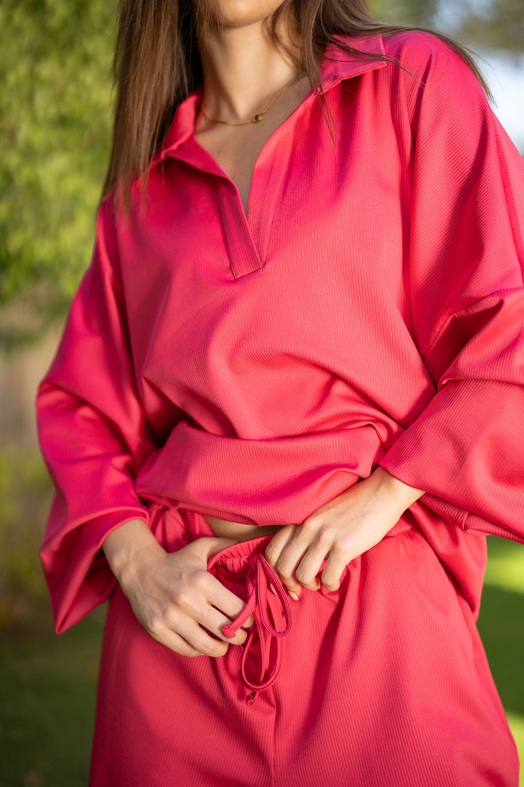 Classic fit soft top with a trendy collar detail. Straight leg pants with an adjustable waist. Comes in four different vibrant colors.