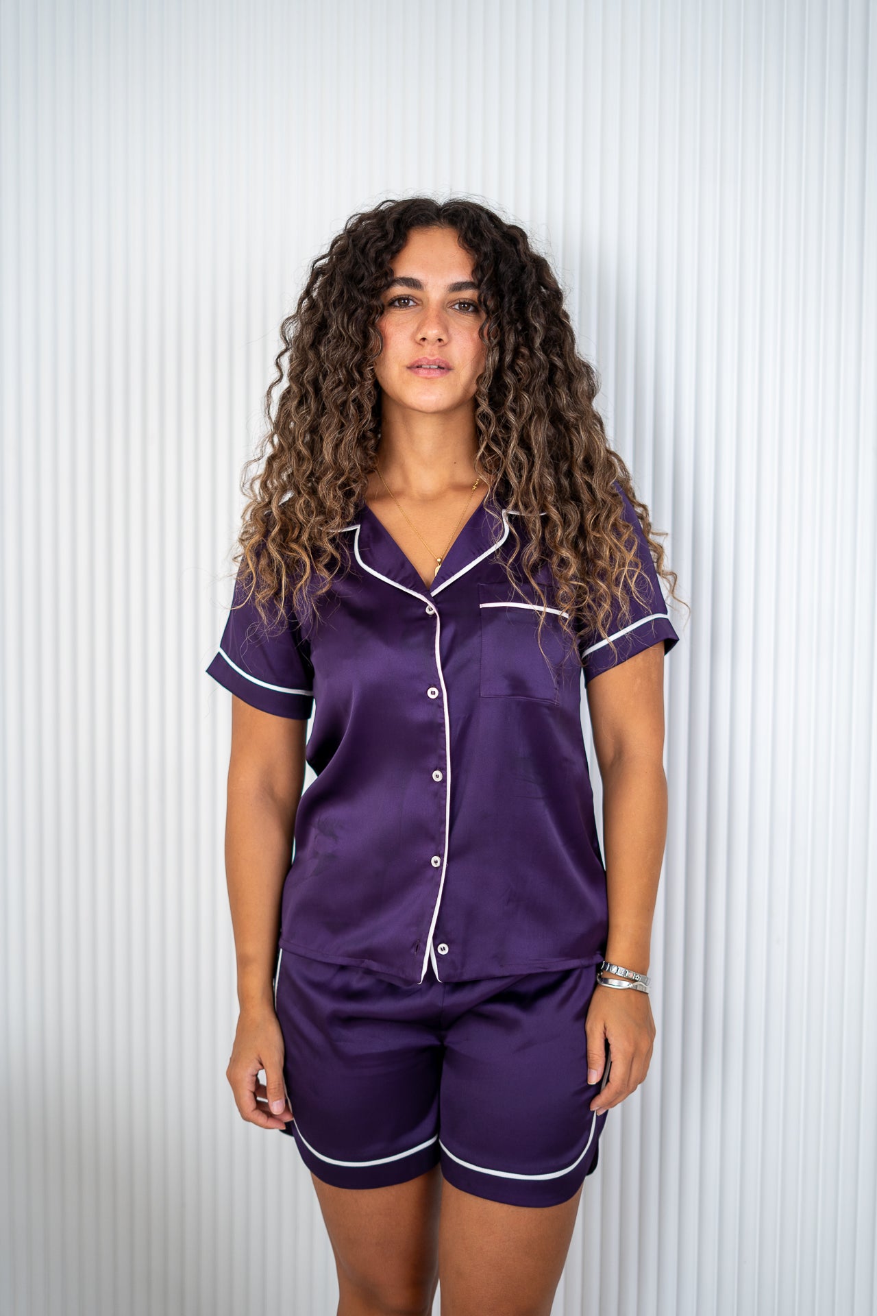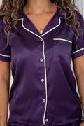 Short-sleeve satin pajama with white piping.