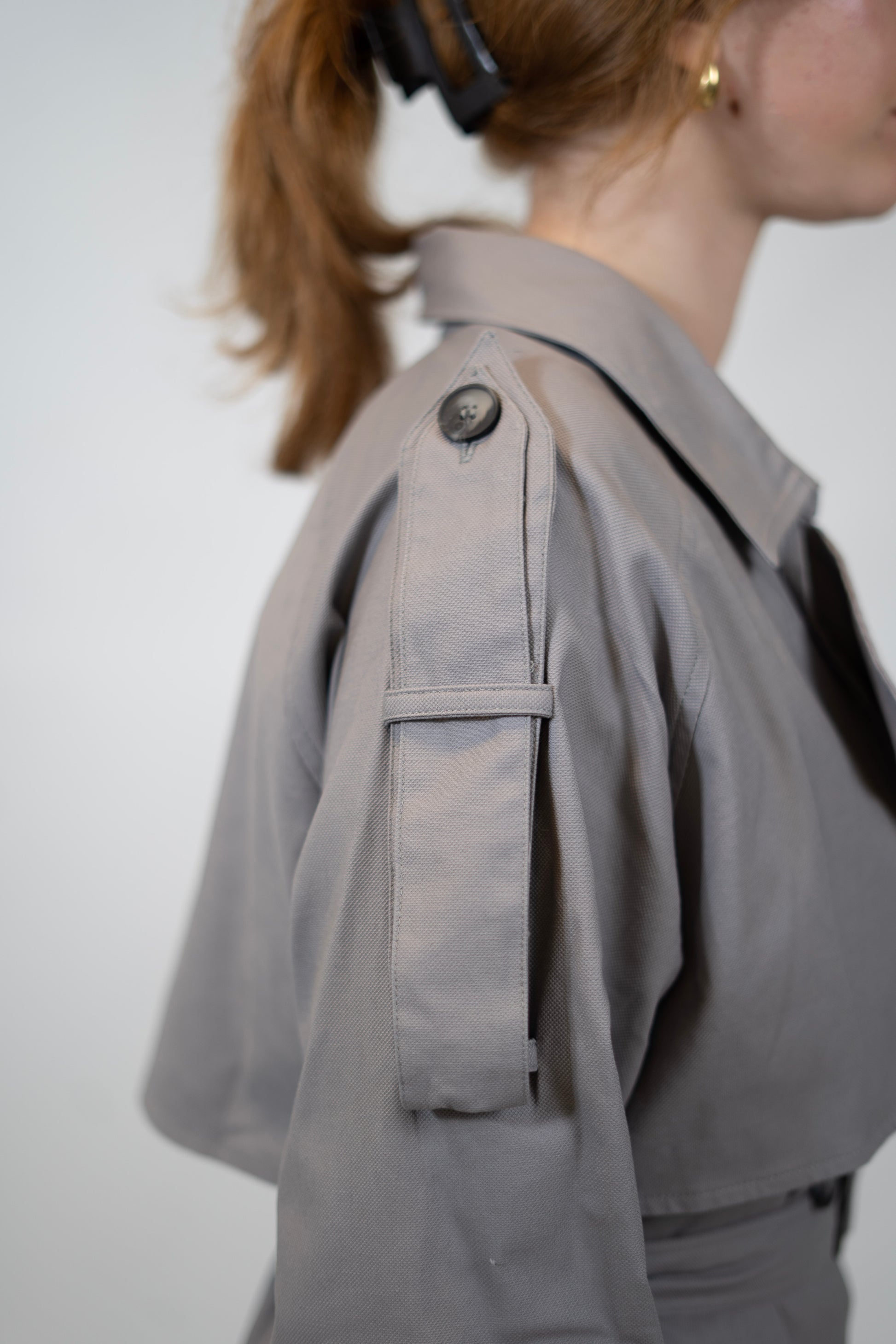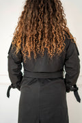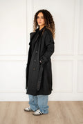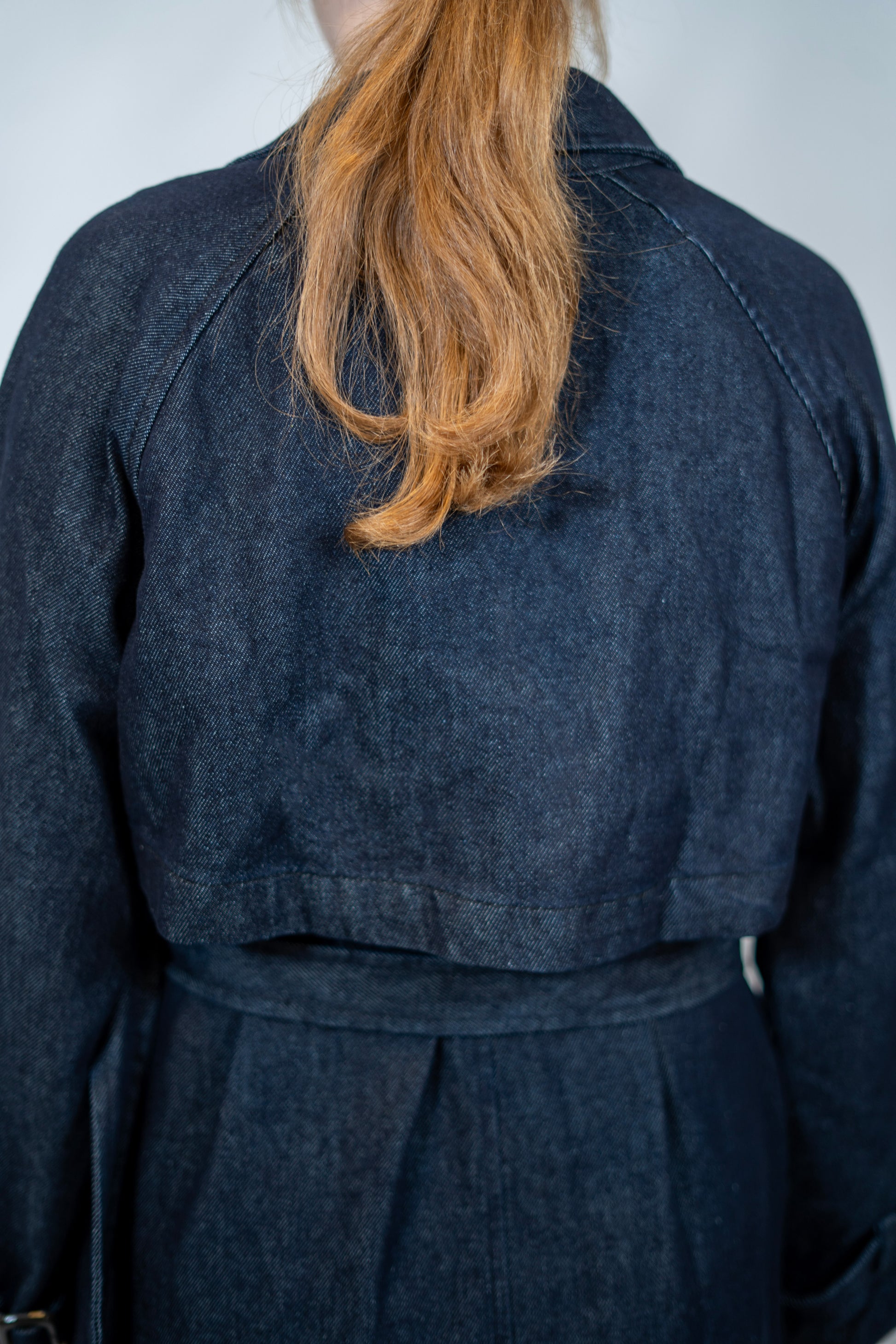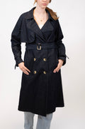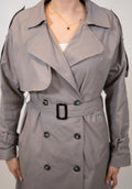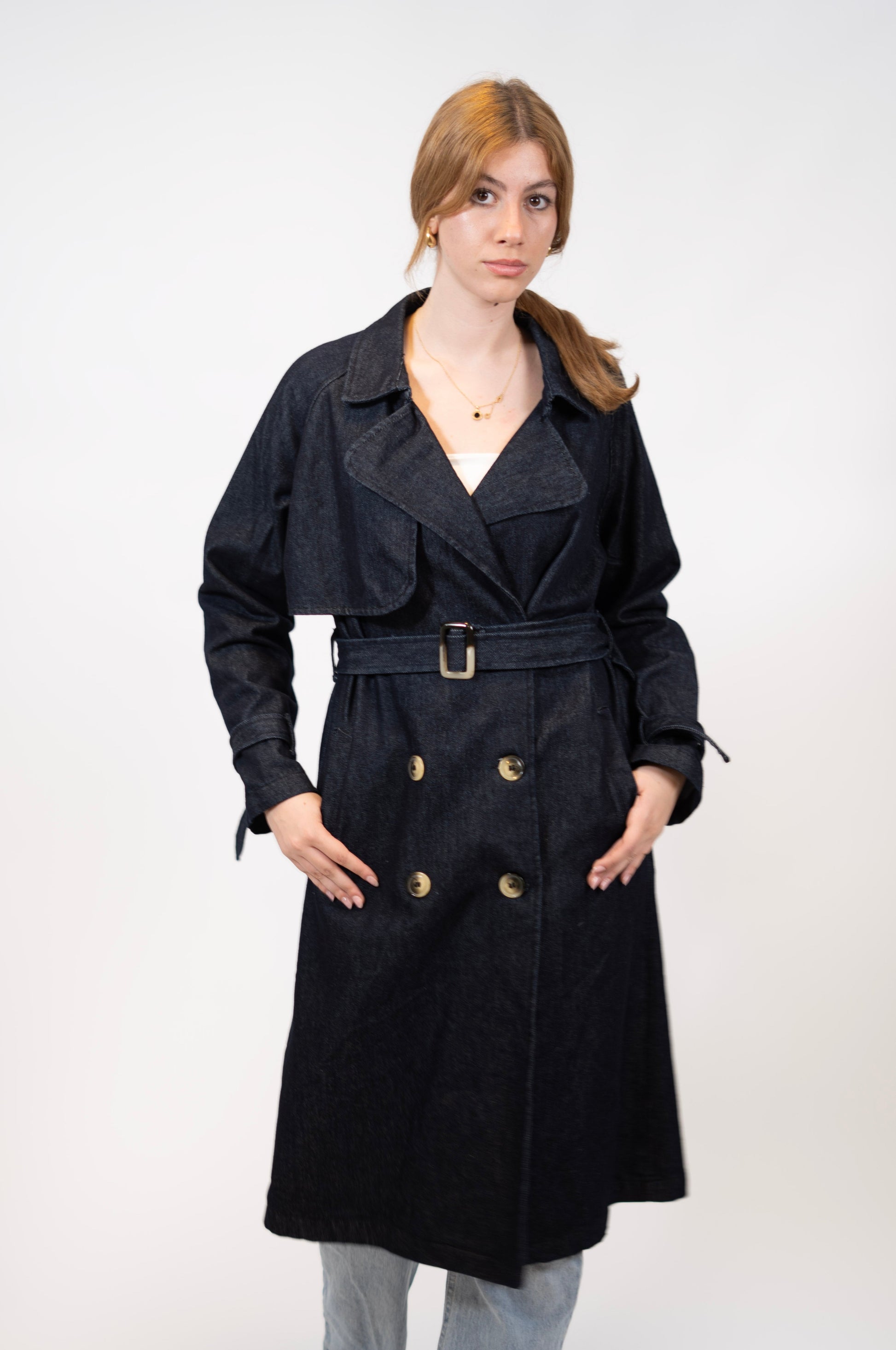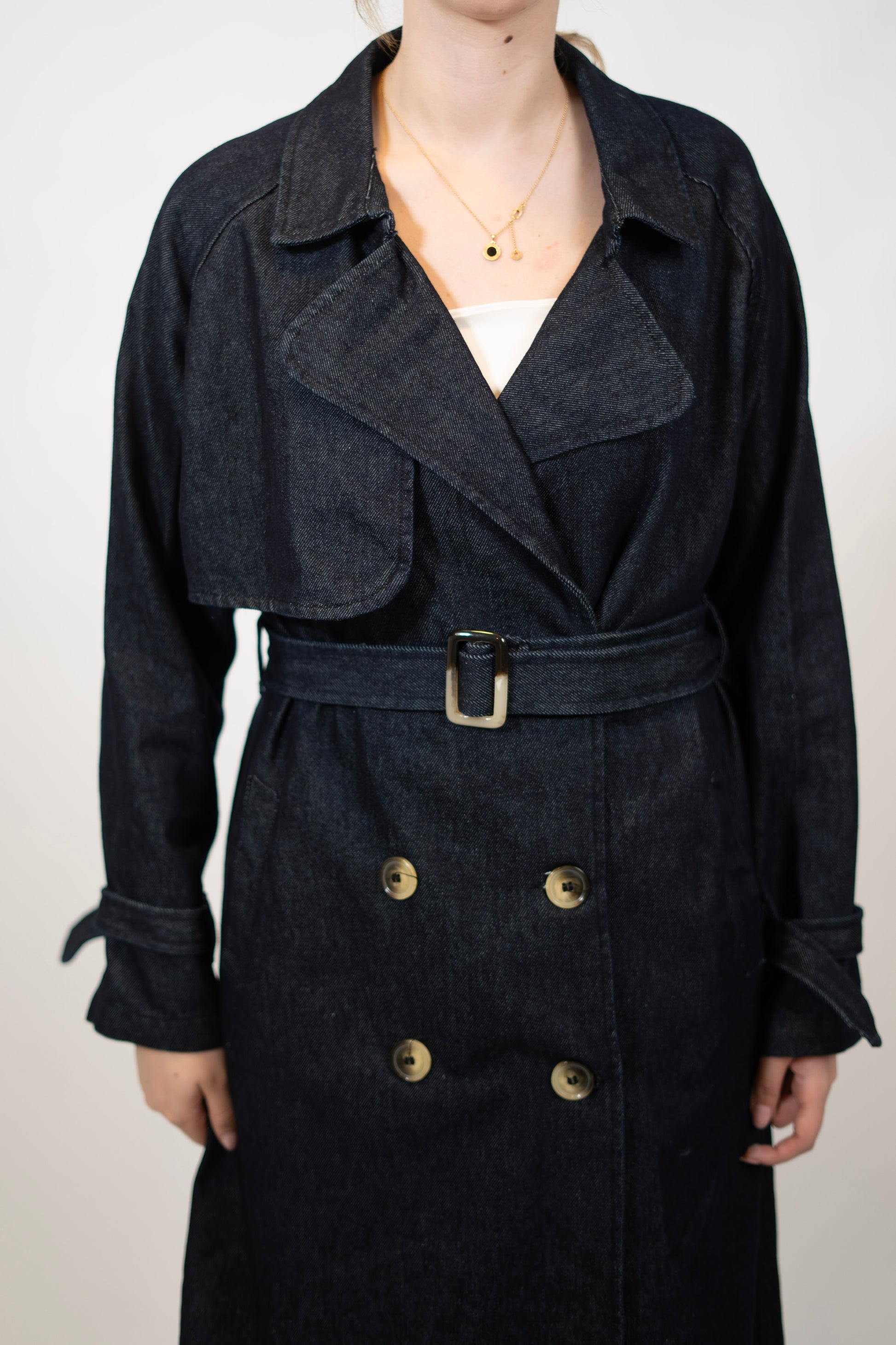 Classic trench coat. Available in three colors, black, denim and grey.
